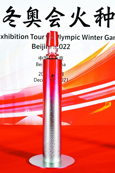 展出的北京冬奥会火种采集自7600公里外的希腊古奥林匹亚遗址,火种灯的造型灵感来自西汉长信宫灯,借“长信”之义,表达人们对光明与希望的追求和向往。