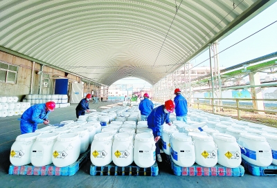 今年以来,江汉盐化工紧贴市场提高消毒剂产能,不断优化生产装置、加强产品研发、细化产品规格,1月至11月共生产漂粉精、强氯精消毒剂产品8.3万吨,分别同比增长14.68%、62.24%。图为12月6日,员工为发往越南与泰国的漂粉精粘贴标签。