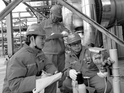中原油田普光气田天然气净化厂组织仪表专业技术人员和专业检测队伍,联合对现场1000余台气体检测仪进行专项体检,确保固定式检测仪检定合格率100%,保障生产环境安全,为实现年底冲刺目标奠定安全基础。图为12月8日,仪表技术人员检查固定式气体检测仪。王东玲 摄