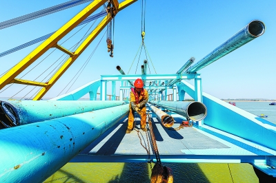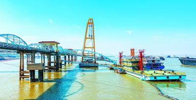 12月3日,九江石化码头运行部与施工单位周密部署、精准定位、安全作业,圆满完成了新建芳烃码头趸船活动斜引桥及支撑杆的安装工作,标志着芳烃配套码头项目主体工程阶段性完工,为芳烃码头按期投运奠定了基础。 大图:九江石化新建芳烃码头趸船活动斜引桥吊装就位,支撑杆安装完毕。 小图:施工人员用手拉葫芦将吊装中的活动引桥牵引至岸边,进行精准定位。 邓 颖 赵石城 摄影报道