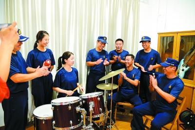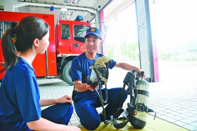 ▲工作之余,妹妹王楠(左二)为哥哥王博(右三)和同事表演架子鼓,为他们缓解工作压力。 ?王博为妹妹王楠讲解消防装备使用技巧。 ?王楠为哥哥王博整理防火服。