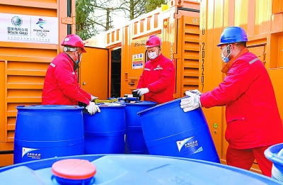 日前,中原油田供电服务中心北京2022年冬奥会保电运维项目组工作人员,在北京市顺义区项目工地,为移动式柴油发电机加注长城润滑油和防冻液。这些柴油发电机将为国家体育场、延庆冬奥场馆、首都体育馆等冬奥会比赛场馆提供电力保障服务。图为项目组工作人员,为即将被送往延庆冬奥场馆的移动式柴油发电机加注防冻液。本报记者 胡庆明 刘 行 摄 曾 丽 文