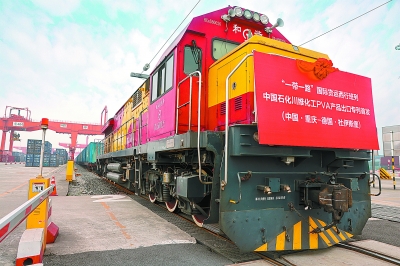 12月24日,从重庆发车的满载川维化工精细化工产品聚乙烯醇(PVA)的中欧班列,抵达终点站德国杜伊斯堡。这是中国石化首次开通火车专列向欧洲客户运输精细化工产品,运输时效比传统的海运方式提高50%以上。图为满载中国石化精细化工产品的中欧班列从重庆出发。陈 琳 摄