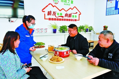 1月1日中午,来自江苏宿迁的货车司机丁海航一行三人,来到安徽池州石油麻桥加油站司机之家休息用餐。站长汪友桃为他们送来腊肉炒大蒜和青椒炒鸡蛋,让司机师傅们在节日里感受家的温暖。 孙宗奎 摄