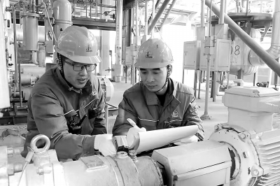 | 操作人员测量记录机泵温度。 张锁扬 摄 |