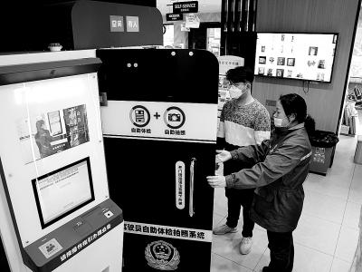 日前,安徽石油首台交管智能体检机落户合肥石油南路加油站。驾驶员通过智能自助设备,可完成视力、辨色力、听力、身高等体检项目和拍照,并可现场打印体检报告和照片,整个流程用时不到3分钟,极大提高了体检效率。图为南路加油站员工指导客户使用交管智能体检机。孙德荣 摄