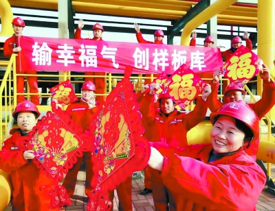 图1:春节将至,中原油田天然气产销厂为一线坚守岗位的员工送去节日慰问品,开展写春联、送祝福系列活动。图为1月29日天然气产销厂储气库管理区员工贴春联、挂福字,迎接春节到来。 范永光 摄 魏园军 文