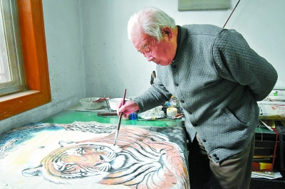 韩学忠 居住在河南濮阳市中原油田技术监测小区的82岁退休员工杨再卿,28年如一日坚持画虎,被人们誉为“中原油城虎王”。他说自己一辈子爱虎,画虎让自己心情畅快,对自己来说真的是能延年益寿。 “虎将”有个画虎梦 1940年,出生于河南濮阳县的杨再卿,小时候从说书人口中知道了许多历史英雄。他最大的梦想,就是长大后做一名“虎将”。 19岁那年,杨再卿参军,被分配到中央警卫局8341部队,在中南海执勤。他训练特别认真刻苦,因为表现好,被提拔为副连级干部。毛主席在天安门广场出席重要活动时,杨再卿是头车上的机枪手,担当保卫毛主席的“开路先锋”。 后来,杨再卿参加自卫反击战,在战场上虎虎生风,带领全连荣立集体一等功。 1970年,杨再卿从部队转业,在河北保定电影胶卷厂动力车间任党支部书记。 1975年,杨再卿的老家濮阳传来好消息:发现了石油。这让杨再卿热血沸腾,他申请调到中原油田工作,参加家乡建设。 1977年,杨再卿如愿以偿地来到中原油田钻井一公司,成为一名工人。 1994年,54岁的杨再卿响应油田政策,从岗位上退休。 悉心观察勤练习 退休后的杨再卿买来笔墨纸砚,从此开始自己的画虎生涯。 但干啥都不会一蹴而就。有一次,他拿着一幅刚画好的老虎给一位邻居老大嫂看。老大嫂看了说:“老杨你这画的是啥呀?狗不像狗猫不像猫的。”听了老大嫂的话,杨再卿脸红到了脖子根。 他买回大量介绍老虎习性的书阅读,参加书画讲座,收集民间老虎的图片资料。中央电视台有个书画节目,他每期必看,学习绘画技艺。为了解老虎的神态、动作举止,他带着马扎到动物园,在虎笼前观察、写生,一个动作往往要画数百遍。平时到任何一个城市,他都要去那个城市的动物园看看,而且只看老虎。 画虎慢慢成“气候” 经过多年练习、研究,杨再卿画虎慢慢成了“气候”,他试着参加油田内部的一些展览、比赛,都获得了不错的奖项。 在第二届中国老年文化书画艺术交流会上,杨再卿不仅获得二等奖,而且参选画作还被编入中国老年文化艺术交流会精品集。近几年,他共有40多幅画作在中国老年书画展中获奖,并在中国美术馆展出。 杨再卿的名声渐渐大了起来,濮阳电视台还为他做了一期长达40分钟的节目。杨再卿说,虎是百兽之王,绘画艺术博大精深,相信画老虎比自己画得好的人,还有很多。 画虎也让杨再卿在健康方面受益匪浅。80多岁的他,每天站立挥笔画虎两三个小时都不感到累。他说:“每次作画我都是全心贯注、精神振奋、协调锻炼,绘画的环境看似安静,实际上心在动、脑在动、周身在动,就像在做保健功。绘画真的能陶冶情操、强体健身。我画虎,益脑益身,快乐无比。”