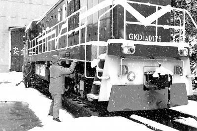 2月6日,南方多地降雪,安庆石化运输部铁路场站积雪厚度达10厘米。2月7日,该公司员工及时清除积雪,确保进出道路安全畅通。图为员工清理机车附近的场地。张立新 摄