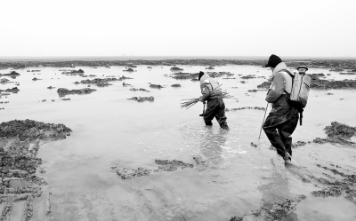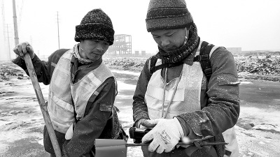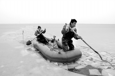 截至目前,套尔河-2022三维地震勘探野外采集项目已完成16万个检波点、4万多个炮点的测量任务。该项目是胜利油田重点勘探项目,工区位于山东省滨州市境内。针对工区内盐田、虾池等水域结冰厚薄不一的实际,地球物理胜利分公司测绘地理信息中心采用挂机橡皮船、罗利冈车、人工破冰等多种方式,保障测量工作稳步推进。图1:测量队员在冒雪测点,精准定位。图2:测量队员在养虾池内破冰前行。图3:测量队员在盐田外围烂泥带施工。张广虎 高玉民 摄影报道