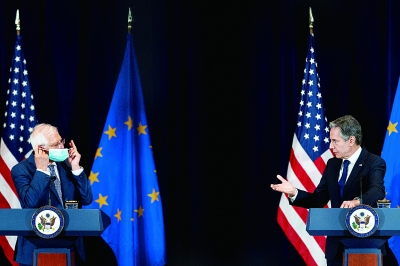 近日,在美国首都华盛顿特区,欧盟外交事务负责人博雷利和负责能源事务的欧盟委员会委员西姆松抵达美国国务院,与美国国务卿布林肯和能源部部长格兰霍姆举行会谈。欧盟委员会主席冯德莱恩表示,正与美国和挪威等国家就增加对欧洲的天然气供应进行谈判,以确保获得更多天然气供应来源。图为欧盟与美国的会谈现场。 视觉中国供图