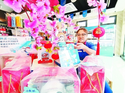 ?地点:河北石家庄石油黄河大道加油站 堆头名称:感受冰雪魅力 造型寓意:将冬奥会吉祥物冰墩墩、雪容融玩具及部分徽章、文具等商品摆放在展台上,并配合融入冰雪、春花等设计元素的店内装饰,寓意徜徉冰雪世界、乐享冰雪运动。 张建恩 摄