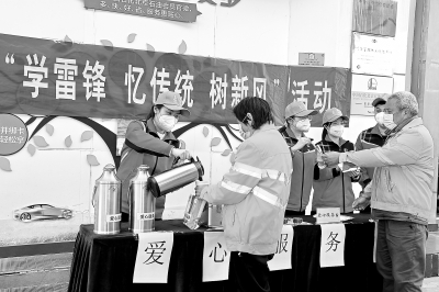 “中国青年志愿者服务日”来临之际,北京石油通过多种形式的青年志愿服务活动,为环卫工人献爱心,用实际行动践行雷锋精神。图为3月2日活动现场,青年志愿者为环卫工人提供热水服务。本报记者 胡庆明 摄 庞 霞 于 慧 文