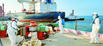 图1:面对疫情防控严峻形势,中科炼化升级防疫措施,强化人员管控、门禁管理、场所消杀等工作,持续织密疫情防控网。图为3月16日,外籍船靠泊中科炼化码头,工作人员认真做好消杀工作。