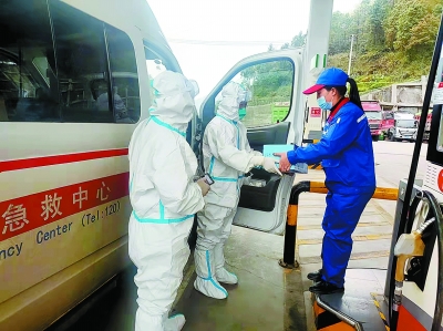 图3:贵州遵义务川县疫情形势严峻,遵义石油为社区防疫工作人员、高速公路出入口执勤人员等送去生活物资;发挥爱心驿站、司机之家作用,为疫情防控人员提供休息区、免费食物。图为3月13日,盘龙加油站员工向应急救援人员赠送卓玛泉。卢 佳 摄
