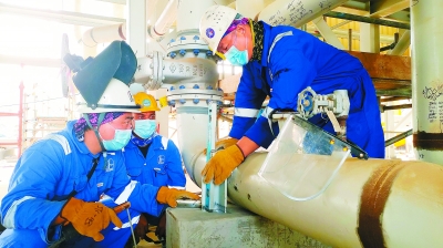 近日,炼化工程集团十建公司阿曼杜库姆炼油项目部将“送培训进现场”“技能比武”“师带徒”作为海外工程人才培养主线,先后组织中外参建员工120余人次参加各类培训,帮助他们提升专业技能。图为2月26日,十建阿曼杜库姆炼油项目部管道安装专业负责人正在指导参建员工开展施工作业。田元武 李 祥 摄影报道