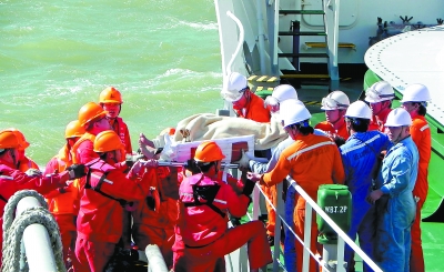 2018年10月1日,“胜利242”船成功救助一名外籍油轮伤员,大家齐心协力帮助伤员下船。