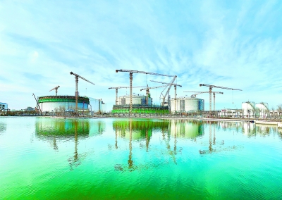 天然气分公司加快推进天津LNG接收站二期项目建设,施工过程中坚持绿色环保理念,大力开展小微湿地示范区、循环经济示范区建设,有效节约资源、降低企业成本,目前5号罐、6号罐正在进行罐内施工。图为天津LNG接收站二期项目建设现场。