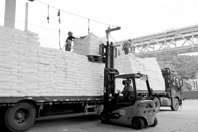 今年以来,巴陵石化根据市场和客户需求,优化调整装置生产负荷,各单位通力配合,着力做大总产量,加快产品出库。一季度,该公司各炼化产品产量均完成季度目标,其中橡胶、树脂产品产量分别同比增长20.35%、13.98%,创历史新高。图为橡胶部产品仓库员工将SEBS(新型热塑弹性体橡胶)产品装车。 徐亮亮 摄