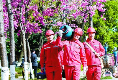 陈 晨 杨晓军 文/图 春城飞花。在昆明,一年四季有不同的景致。 有这么一群人,穿梭在春城的街头巷尾,行走在春花、夏草、秋叶和冬阳之间,将无数个液化气瓶送到城市的大街小巷。 他们是西南石油局云南燃气公司的液化气配送员。他们手中的每一个液化气瓶,都承载着民生保供沉甸甸的责任。 从轻敲房门步入室内,到检查更换钢瓶,再到安全验收签字确认,他们需要完成检查用气环境、检查灶具与胶管连接、上紧减压阀、接头试漏、调试火焰、告知用户注意事项等15道工序。 热腾腾的火锅、香喷喷的米饭、火辣辣的烧烤……在诱人的美食和火热的灶台背后,是液化气配送员提前对接液化气供应需求,挨家挨户上门服务。对居民小区内独居或高龄的老人,他们总会特别留心,细致地为老人讲解使用液化气的安全注意事项。 你在家中饭菜飘香,我来守护用气安全。