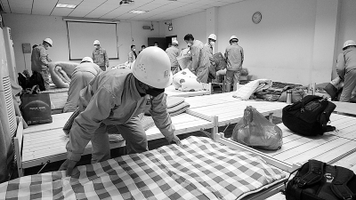 为保障上海石化在建项目不受疫情影响,上海石化利用培训中心教室资源临时安置承包商工人,并为入住人员提供免费热水、定时送餐、清扫楼道等后勤保障服务。图为首批承包商工人入住安置点。 吴 伟 摄