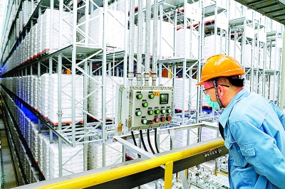 一季度,镇海炼化生产聚烯烃新产品专用料约16万吨,占聚烯烃总产量的64.5%,差异化效益显著,同时研发生产新产品两个,目前均已发往下游客户使用。图为聚烯烃装置操作人员在2号聚烯烃立体库检查自动输送机运行情况。 万 里 摄 杨 旭 文