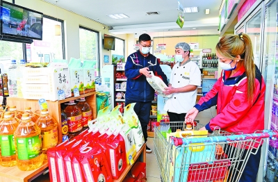 近日,北京疫情出现反弹,北京石油积极组织调配油品资源和民生物资商品,确保加油站和便利店运营平稳。重点加油站按日销量的1.5倍保持库存,便利店每天及时上架商品、补货到位。易捷仓库加大备货量,垫高基础商品库存,并根据加油站销售情况,增加物流配送频次,24小时不间断配送,确保商品供应充足。截至目前,北京石油粮油产品备货16万件,奶制品备货2万提,饮用水备货9万箱,口罩备货超9000万只,全力满足市民生活需求。图为4月26日,顾客在北京石油日坛加油站购买粮油物资。 本报记者 胡庆明 摄 于 慧 杨 蕊 文