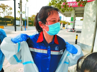 上海石油交大加油站员工屠春艳穿着“大白”防护服提供加油服务。一上午的工作后,工装完全被汗水浸湿了。 丁玉霞 摄