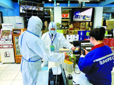 医务工作人员到站购物,上海石油广虹加油站员工提供贴心服务。诸静辉 摄