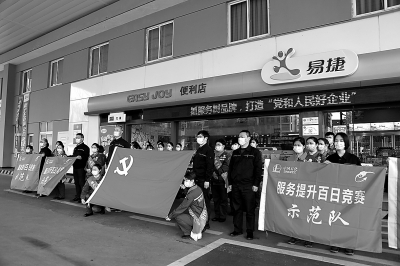 近日,浙江湖州石油着眼“新服务、新标准、新形象”,举行了“加油站服务提升百日竞赛”活动示范队授旗仪式,推出7支服务示范队并授旗,切实展现了中国石化品牌形象。图为示范队授旗仪式现场。 柴芮栋 徐 婕 摄影报道