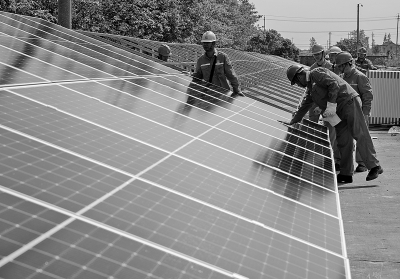 江苏油田利用闲置场地安装光伏板,目前井场光伏项目总装机容量达6.2兆瓦,累计发电约600万千瓦时,有效助力碳减排。图为4月28日,该油田联盟庄区块现场,员工正在安装光伏板。范友林 摄