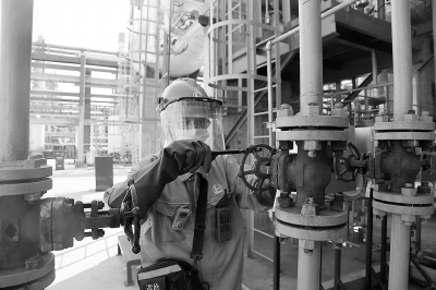 镇海炼化烷基化装置是生产高标号汽油的关键装置,他们抓好疫情防控和精细操作,保证了前4个月高标号汽油足量稳定供应。图为外操人员调整碱液流量,保装置平稳生产。 郭海艳 摄