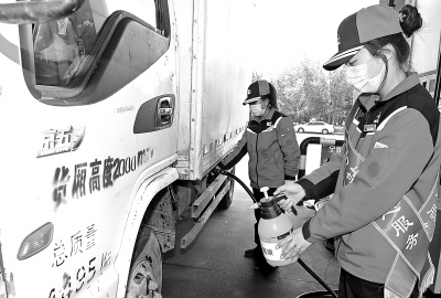 5月初以来,北京疫情防控形势严峻,北京石油第一时间调资源保供应,为防疫救援和蔬菜运输车开设绿色通道,确保防疫不松劲、供应不断档。图为北京石油中垦丰南加油站员工为运送蔬菜的车消杀加油。 本报记者 胡庆明 摄 宾鑫莉 文