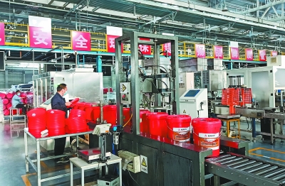本轮疫情发生以来,润滑油公司坚持疫情防控与安全保供两手抓、两不误,全力开展隐患排查,增加巡检频次,强化工作场所消杀,安排员工驻厂坚守岗位全力生产润滑油产品,确保市场需求。图为5月17日,该公司生产线对专用发动机油进行灌装。佟 炜 摄