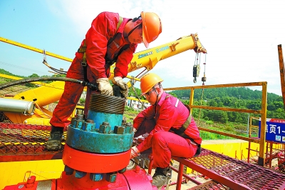员工正在焦页1 扩平台更换井口法兰盘。彭 景 摄