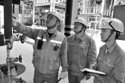 5月20日,金陵石化3号连续重整装置党员攻关小组现场研讨优化措施。王 恒 摄