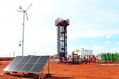 华北油气东胜气田排水采气井站安装的“风光互补”发电装置。