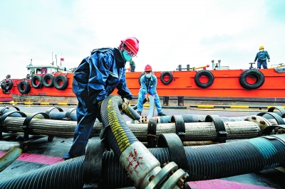 油轮停靠在高桥石化黄浦江码头,操作人员布置输油管准备装运高品质润滑油。