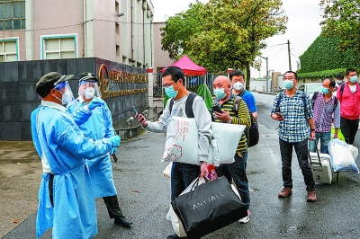 高桥石化加快项目建设复工进程,图为施工承包商人员带着行李进入厂区。