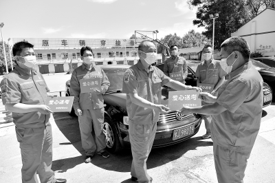 高考期间,中原油田车辆管理中心开展“爱心送考”志愿服务。该中心协调5辆车为助考服务车,并组织中心司机成立志愿服务队,为油田区域出行不便考生提供车辆接送服务,为考生及家长在高考期间发生应急情况时提供用车服务,为助考点运送饮用水等物资。图为6月6日,车辆管理中心为“爱心送考”的志愿司机发放标识牌。陈 涛 摄 雷 茜 文