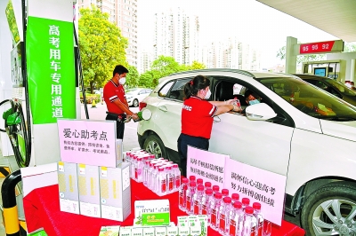6月7日,全国高考开考,北京地区有4.8万名考生参加考试。北京石油在考场周边加油站设置专用通道,搭建爱心助考点,免费提供饮用水、口罩、消毒湿巾等物品,为考生和家长营造舒心的候考环境。图为望京新城加油站员工为准备接送考生的车辆加油。 本报记者 胡庆明 刘 行 摄 于 慧 杨 蕊 文