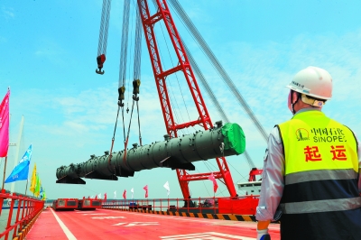 6月6日,在湖南岳阳云溪区长江岸线临时大件码头,巴陵石化己内酰胺产业链搬迁与转型升级发展项目最重大件设备——总重量达913吨的净化装置变换器吸收塔,由中石化起运公司顺利完成起重卸船吊装。截至目前,该项目完成总体进度的54%。图为吸收塔上段卸船起吊装车现场。