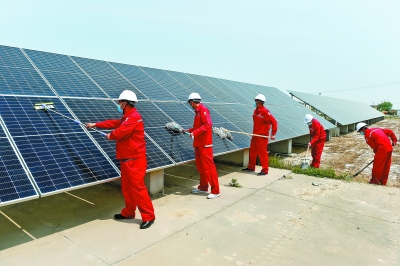 新能源专职运维人员正在清洁维护孤东二区光伏发电设备。