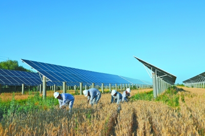 正值麦收时节,新星公司“农光互补”光伏发电项目——冯雷光伏发电站内,近百亩黑小麦喜获丰收,预计产量超1万公斤。 新星公司利用陕西省白水县贫瘠干旱的闲置土地,于2017年6月建成该项目,设计装机容量20兆瓦。他们改良和利用光伏板间隙土地,种植近百亩黑小麦,建设100余个蔬菜等大棚,有效带动周边村民就业致富。图为6月14日工作人员进行黑小麦收割前准备工作。 董 涵 摄 曹海峰 周国娟 文