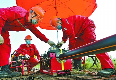 今年以来,胜利油田孤东采油厂对九区南40余口井的地面线路开展配套施工,由原来的罐车拉运原油改为管线运输。6月上旬全面完成地面配套工作。图为员工在施工现场焊接天然气管线。 朱克民 摄 尹永华 文