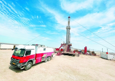 上图:哈萨克斯坦北布扎奇油田NB922井施工现场。 右图:经纬公司中原测控公司员工在NB922井进行完井测井施工。张艳宇 摄