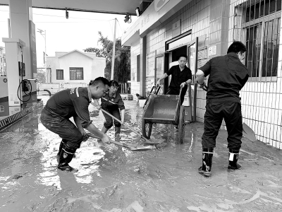 ▲6月13日,江西赣州韩坊镇因暴雨引发山洪,赣州石油韩坊加油站受灾。该公司组织志愿者到该站处理险情,消除安全隐患,使该站尽快恢复营业,保障抢险救援油品供应。图为志愿者清理地面淤泥。谢晓明 摄