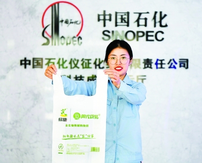 下图为仪征化纤员工展示生物可降解塑料袋。刘玉福 摄