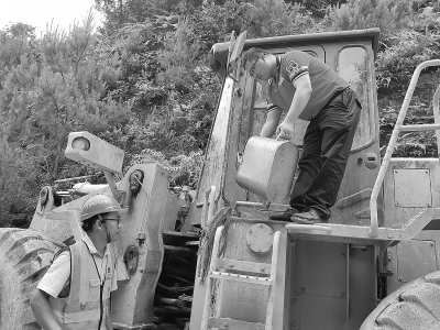6月20日,广西来宾金秀长垌乡古占村公路因暴雨发生塌方,清障车辆因断油不能正常工作。客户打电话给来宾石油金秀县城加油站,要求紧急配送柴油。员工接电话后,马上使用油桶灌装柴油,30分钟将柴油送到塌方现场。图为员工为清障车加油。 张家能 摄 陶 臻 文