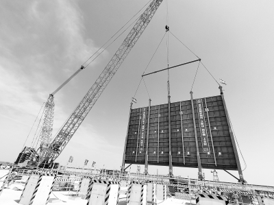 6月25日,四建公司将天津南港乙烯工程项目乙烯装置1号裂解炉的首件辐射段炉壁板安全吊装就位,标志着天津南港乙烯装置正式进入安装阶段。辐射段炉壁板重34.5吨,长26米,高17.6米,呈片状,吊装难度较大。项目部精心组织,及时优化方案,顺利吊装就位,为接下来的安装施工打下坚实基础。图为吊装过程中的1号辐射段炉壁板。曲照贵 摄 李 伟 文